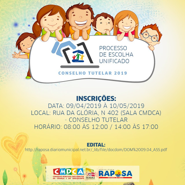 O CMDCA [Conselho Municipal dos Direitos da Criança e do Adolescente], no uso de suas atribuições legais, conforme preconiza a Lei Federal nº 8.069/90 – ECA, revogada pela Lei 12.696 de 25 de julho de 2012; pela Resolução nº 170/2014 do Conselho Nacional dos Direitos da Criança e do Adolescente – CONANDA, pela Lei Municipal nº 111 de 2006, revogada pela Lei 254/201, torna público o lançamento do Edital nº 01/2019, para o processo de escolha dos membros do Conselho Tutelar para o período de 2019 a 2022.