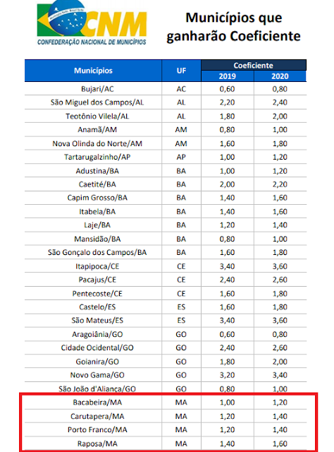 Tiveram aumento do valor do coeficiente do FPM as cidades de Bacabeira, Carutapera, Porto Franco e Raposa (veja quadro acima).