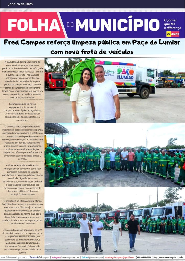 A manutenção da limpeza urbana de ruas, avenidas, praças e espaços públicos de Paço do Lumiar foi reforçada na manhã desta sexta-feira (10). Durante o evento, o prefeito Fred Campos entregou novos equipamentos que atenderão às demandas de limpeza pública da cidade. A entrega ocorreu dentro do lançamento do Programa Limpa Paço, uma iniciativa que marca um avanço na gestão de resíduos e cuidado com os espaços urbanos.